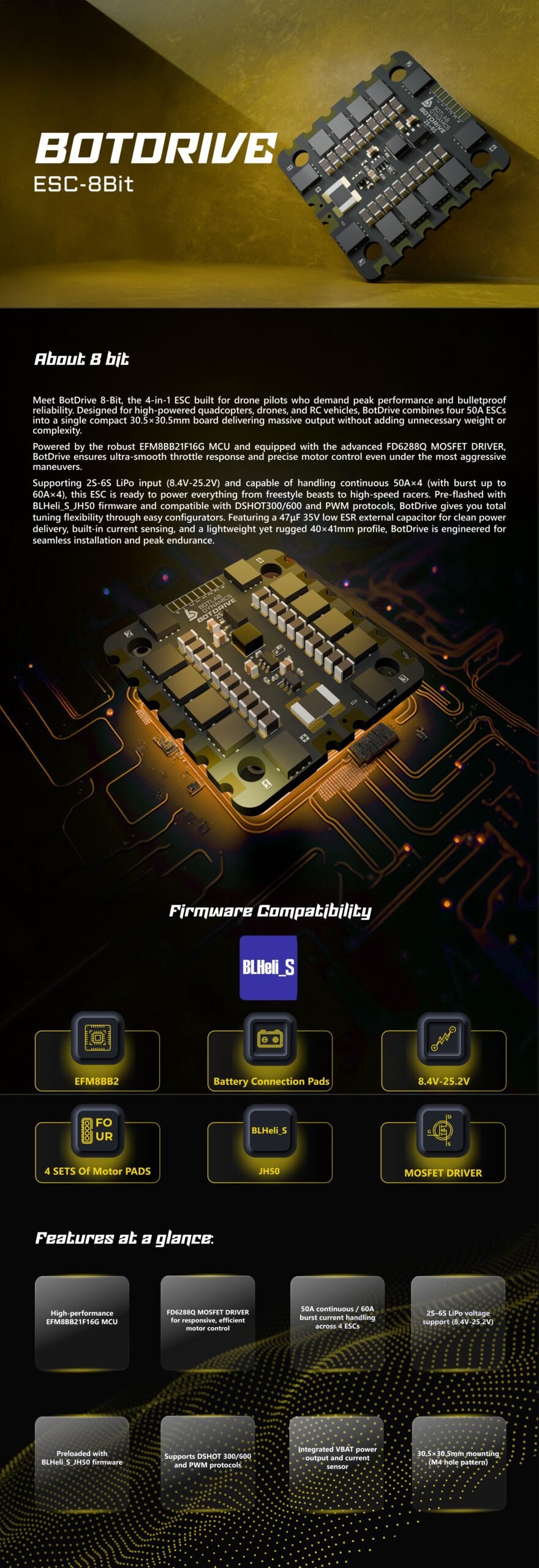 The Botdrive 8-bit 50A 4-in-1 ESC combines power and reliability in a compact design. Built on the EFM8BB21F16G MCU with BLHeli firmware, it delivers smooth throttle response and precise motor control for FPV racing, freestyle, and high-performance drones. With 50A continuous (60A burst) per channel, 2-6S LiPo support, and DSHOT/PWM protocols, it ensures stable power for demanding quadcopter builds. Easy to configure, lightweight, and durable. It’s a great choice for pilots who need dependable performance.