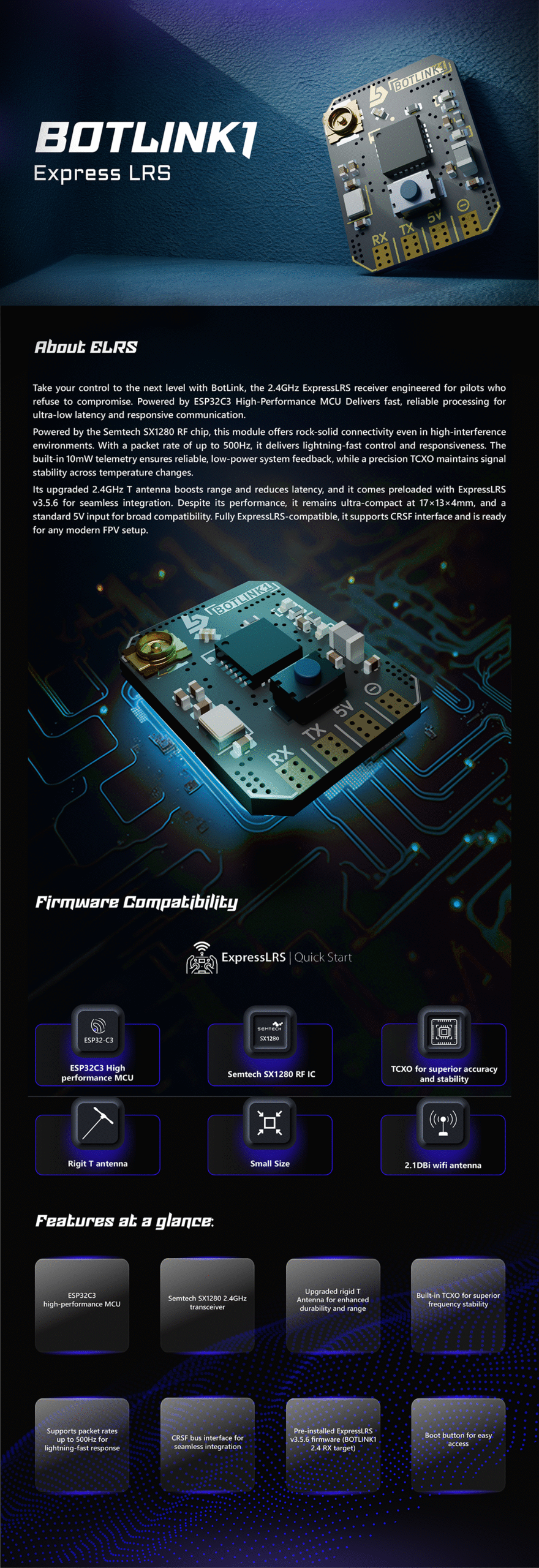 - High-Performance ELRS Receiver: Built with an ESP32 chip and fully compatible with ExpressLRS firmware right out of the box.