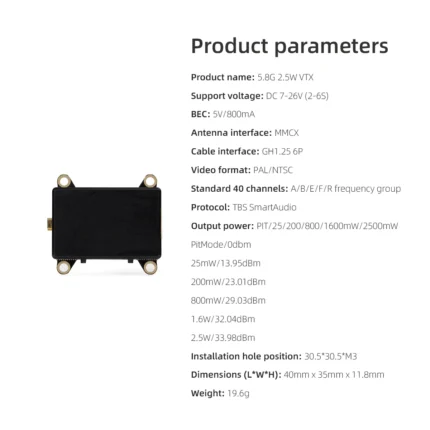* 2500mW high power, maintaining sufficient power output, suitable for long range and ultra-long distance flights. * 6 power levels