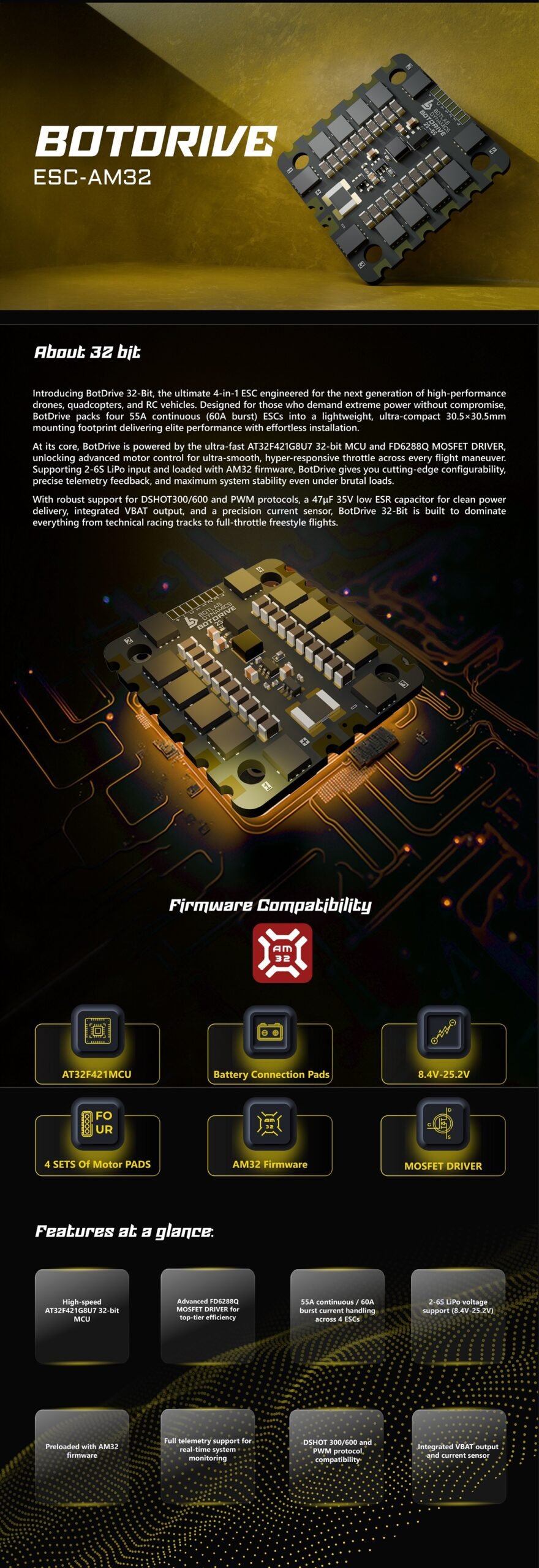- Powerful 32-Bit ESC: 4-in-1 ESC with AT32F421G8U7 MCU for smooth and precise motor control.